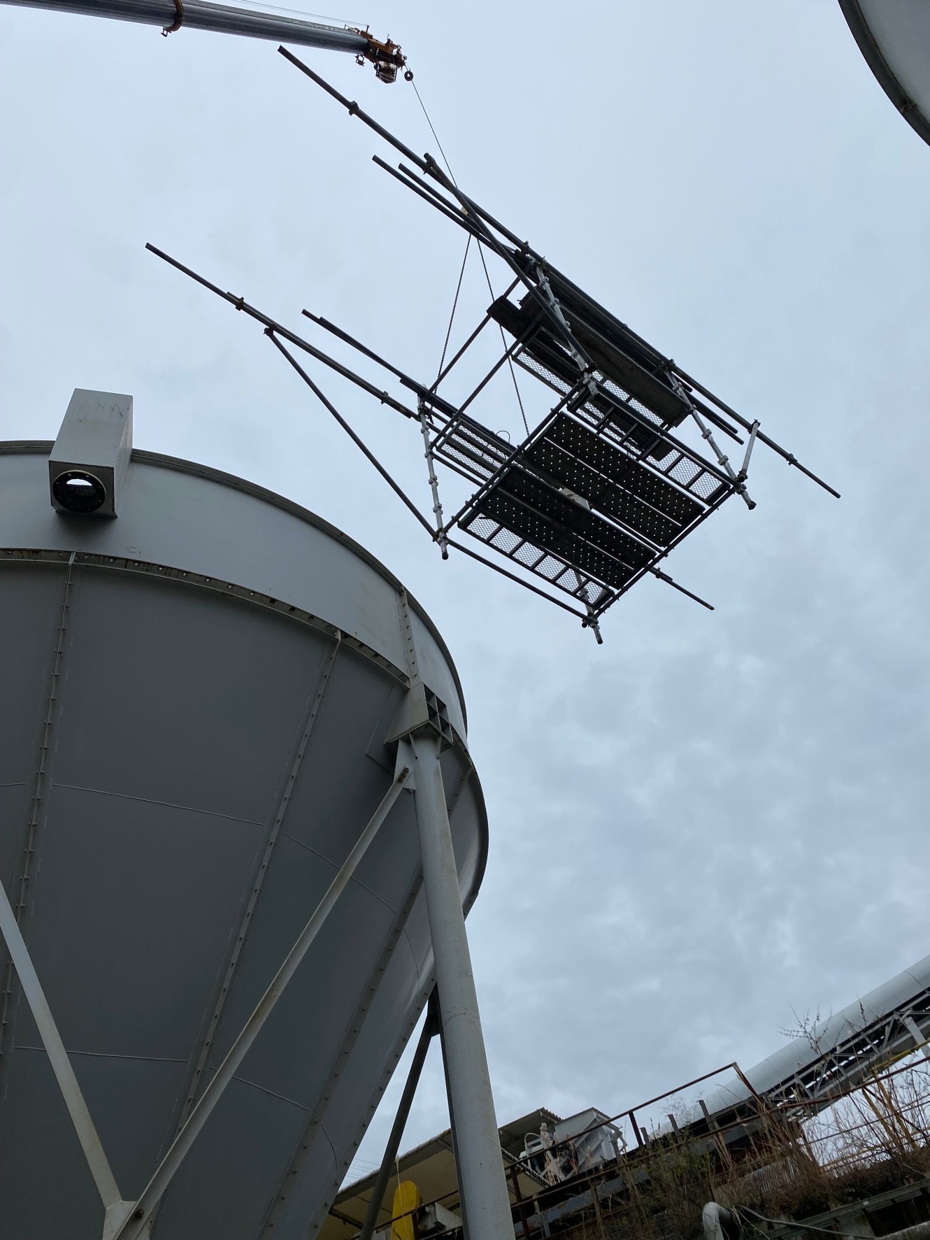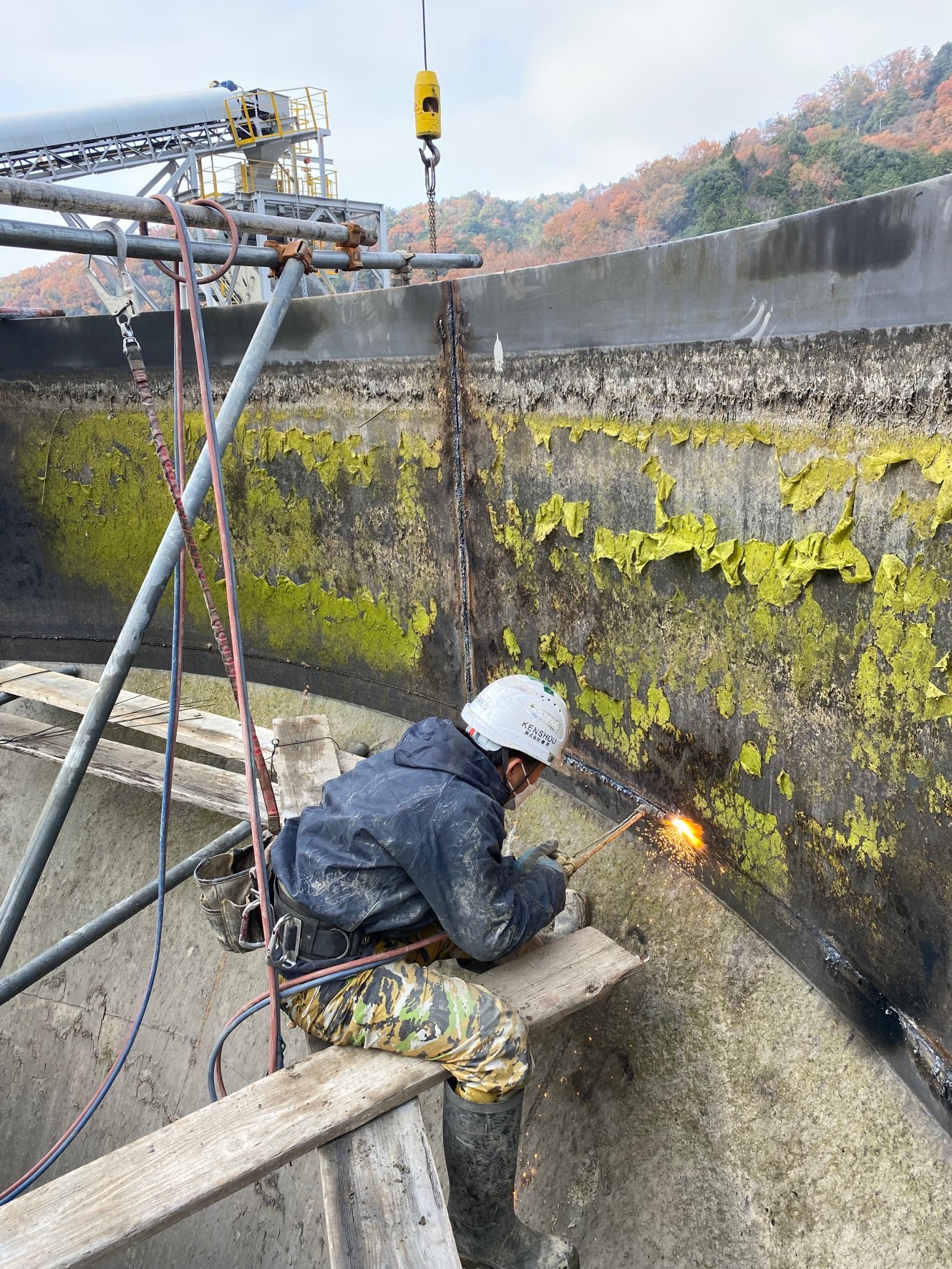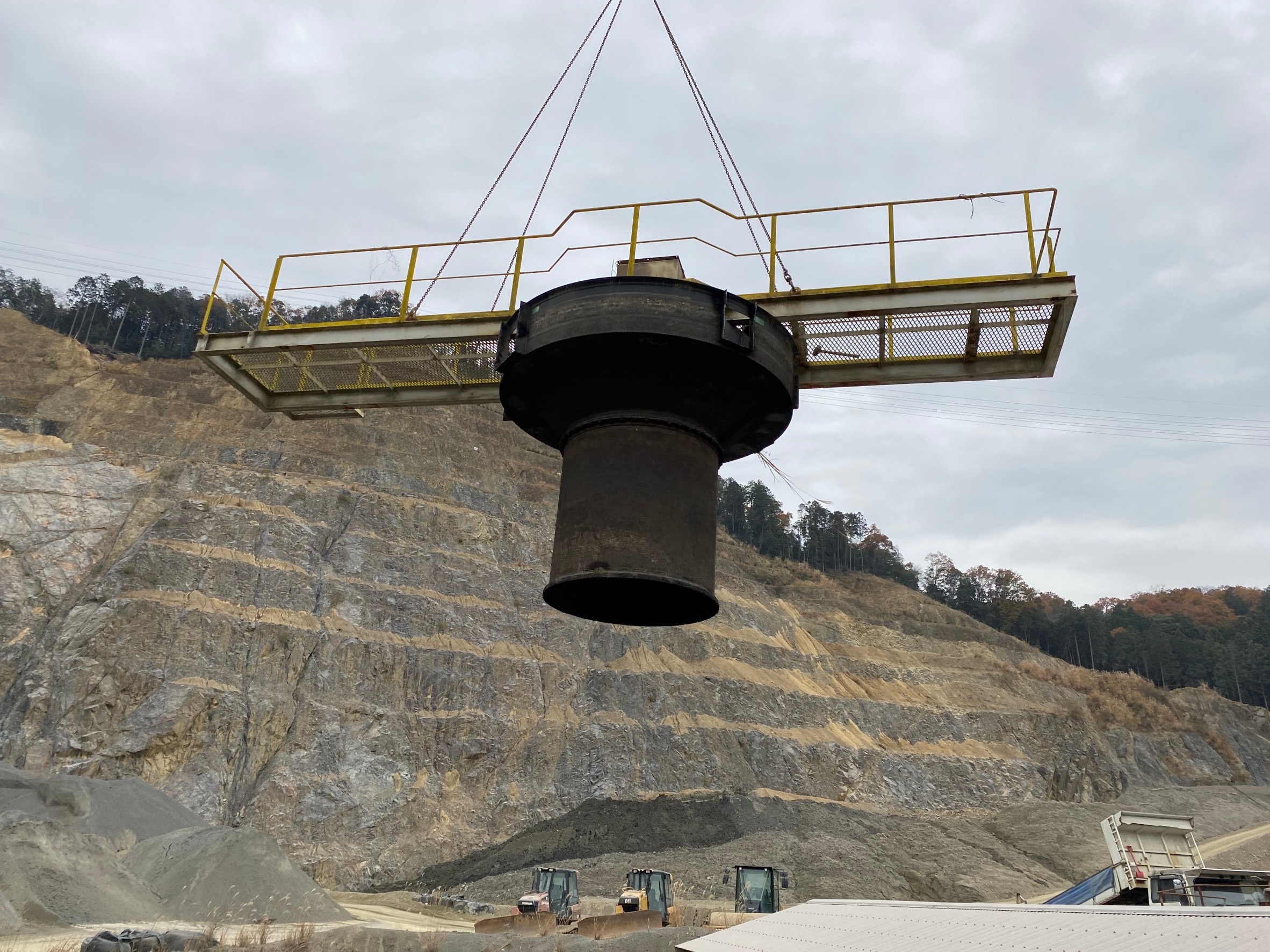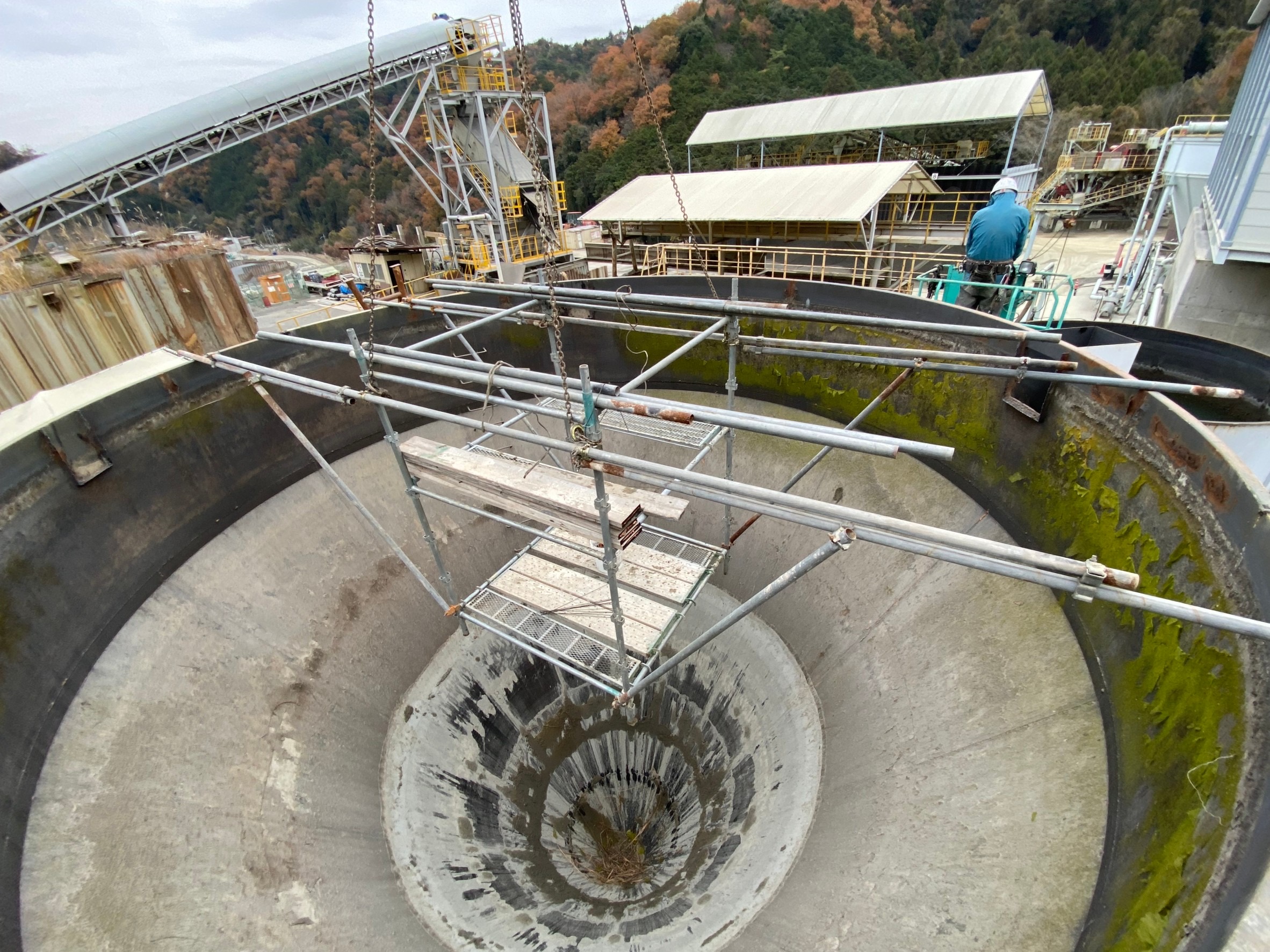 『シックナー移設工事』 2023/12/20 京都某砕石場!! 『シックナー移設工事』 シックナーとは シックナーとは、懸濁液中に混在する固体微粒子を重力で沈降させる装置で懸濁液を清澄水と汚泥に分離させます。 槽底部に堆積した汚泥は、中心の回転軸に取り付けられた かき取り羽根(レーキ)で中心部に集められ排出されていきます。 中々ない工事で勉強になりました!!